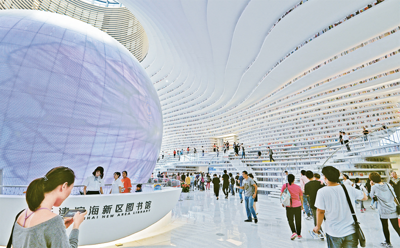 天津滨海新区文化中心图书馆面积33700平方米、可藏书120万册、座席1000多个,其标志形象是“滨海之眼”和“书山”,多次以“中国最美图书馆”刷屏全网。图为滨海新区文化中心图书馆。 天津市委宣传部供图