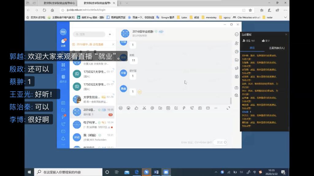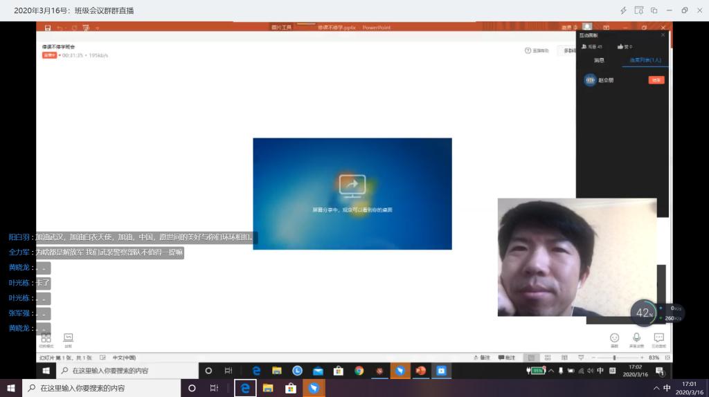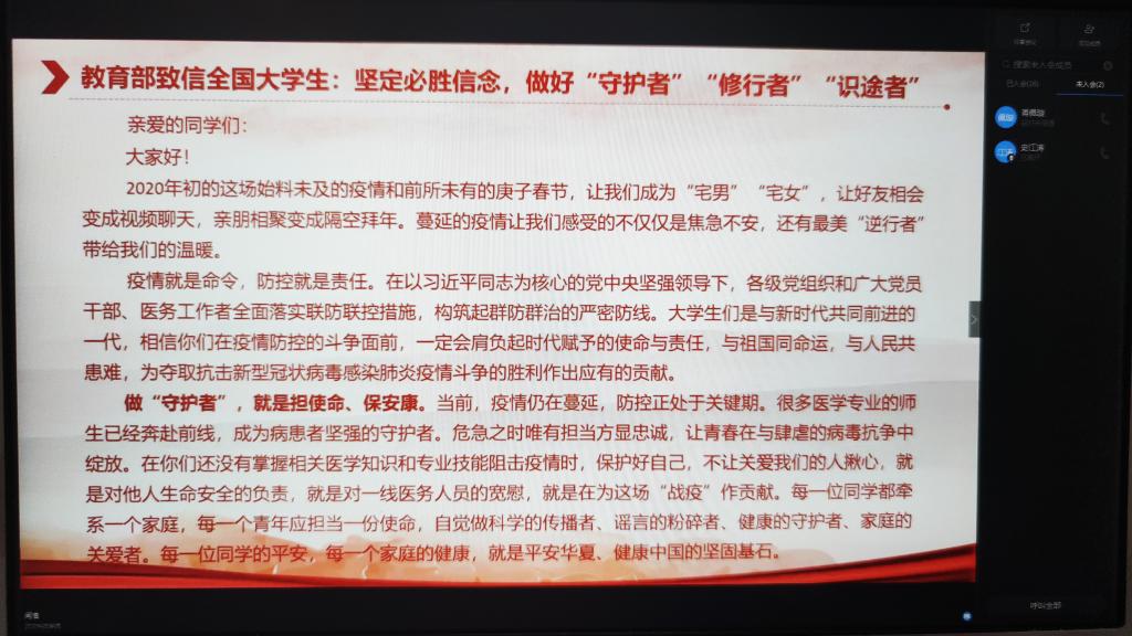 2016级是应届毕业班,面临毕业和就业的双重压力,为帮助同学们正确认识疫情,鼓励大家积极应对就业压力,316日—320日期间,电气工程及其自动化、测控技术与仪器、通信工程分别以专业为单位召开了疫情与就业线上主题班会。电控学院党总支书记贾甚杰和各专业教研室老师们参加了班会,学校教学科研教辅党总支书记刘文堂作为联系班级的中层干部应邀参加了电气专业班会。会上,辅导员郭越对学校目前的防疫工作进行详细介绍和要求,督促同学们及时完成每日健康打卡,并及时如实上报变动情况,强调了瞒报误报迟报的严重后果,并对不按时完成的同学进行批评指正。鼓励关心目前身处湖北省的同学,表扬在疫情过程中勇于担当的志愿者同学,传播正能量引导学生们战胜疫情的信心。因疫情影响,2020届毕业生面临的就业压力前所未有,同学们的就业也成了老师们最为关心的事情,利用本次线上主题班会的契机,与会领导老师们都对同学们的就业提出了指导建议,同时各专业老师及辅导员针对学生目前最关心的毕业设计、考研就业等问题进行了细致解答,同学们纷纷表示一定会与老师保持密切畅通的沟通,为毕业设计及就业工作的顺利开展打下坚实基础。学院党总支书记贾甚杰对主题班会进行了总结,鼓励同学们从疫情抗战工作中要学会思考,要更加爱国,学会如何尊重生命,学会如何理解规则,学会如何担当,并推荐同学们阅读316日习近平总书记给北京大学援鄂医疗队全体“90后”党员的回信,鼓励作为90后的防灾青年更应担当时代使命,青年一代有理想、有本领、有担当,国家就有前途,民族就有希望。