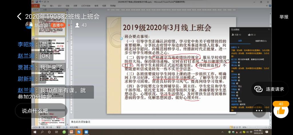20198个班级在辅导员胡治国的指导下以班级为单位分别召开此次线上主题班会。此次班会受到了校领导和联系班级的相关处室中层领导干部的大力支持,学校副校长洪利教授参加了2019级测控—地震仪器协同实验班的主题班会,基建处处长向勇、后勤管理处副处长高伟和电控学院党总支书记贾甚杰分别参加了190512班、190511班和190522班线上主题班会。2019级各班班主任和班级全体同学参加了本次班会。会上分享了我院学生在抗击疫情志愿服务工作中的先进事迹,号召同学们踊跃向先进榜样学习,传播新时代正能量,进一步引导同学们增强必胜之心。辅导员胡治国老师倡导学生严格遵守当地疫情防控规定,服从学校疫情防控大局,保持联络通畅,及时准确在钉钉系统完成“每日健康情况”打卡工作,并强调未接到正式返校通知前,所有人不得提前返校,不要听信或转发不实开学信息。学校各级领导和班主任老师积极关心同学们的在线学习情况,了解同学们学习需求和学习困难,对同学们如何更好适应学习新模式给出了针对性指导意见,建议各班级建立明确网上学习纪律,营造良好的学习风气,提高网络学习效果。同学们极参与班会讨论,就“新冠肺炎疫情影响以及给我们工作学习带来的新思路和挑战”话题展开了热烈讨论。