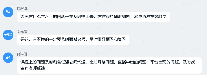 2018级电气专业和通信专业认真落实学校《关于组织召开线上主题班会的通知》要求,精心筹办线上主题班会,会前深入了解同学们的思想动态,收集班级同学参加抗击疫情志愿服务的先进事迹,汇总同学们在线上教学过程中遇到的问题,为主题班会的成功召开做好了前期准备。180513班、180512班、180511班、180532班、180531班分别于31614:3015:2015:3016:2016:3017:2031714:3015:3032016:3017:20通过钉钉线上直播方式召开了“停课不停学”主题的“云班会”。辅导员阎光耀、班主任王新刚、谢维、邱忠超、储琳琳、刘春侠以及联系相关班级的学院中层干部学校党委组织部副部长赵会朋、招生就业处处长张振和电控学院院长蔡建羡出席参加了此次系列主题班会。班会首先对我院在此次抗击疫情工作中涌现出的志愿者同学的先进事迹进行了报道,向他们的勇敢担责和辛勤付出表示崇高的敬意,并鼓励号召同学们向他们学习。辅导员阎光耀向同学们传达了疫情防控期间学校的各项要求,教育引导同学们科学认知疫情、科学防范疫情,服从学校疫情防控大局,及时准确上报个人健康信息,同时鼓励同学们坚定理想信念,保持理性认知,增强战“疫”必胜信心。班主任老师叮嘱同学们按要求开展在线学习,合理规划学习生活,做好课前预习和课后复习,有不懂得知识点要做好汇总并及时上报各科老师。参加班会的学校中层领导干部叮嘱同学们严格遵守当地疫情防控规定,尽快调整状态以适应在线学习的新要求,有学习、生活上的困难及时联系老师们,老师们愿意竭尽所能帮助大家。会上,老师们还对同学们普遍关注的开学时间和形式、线上与线下学习的衔接等问题给予了细心的解答。班会过程中,同学们积极互动,老师们即时答疑,提高了网络教育工作水平,强化了同学们的学习意识和纪律意识,为疫情过后的返校做好了前期的准备。在疫情防控期间,组织召开此次线上主题班会,为老师与同学们沟通交流搭建了桥梁,传递了学校和老师们的温暖关怀,对同学们认清形势、科学防疫、稳定情绪、增强信心起到了积极作用。同学们纷纷表示应扛起责任和担当,积极配合学校各项防控措施,并从自身做起、从身边做起,管好自己,做好自己,为国家和社会作贡献。