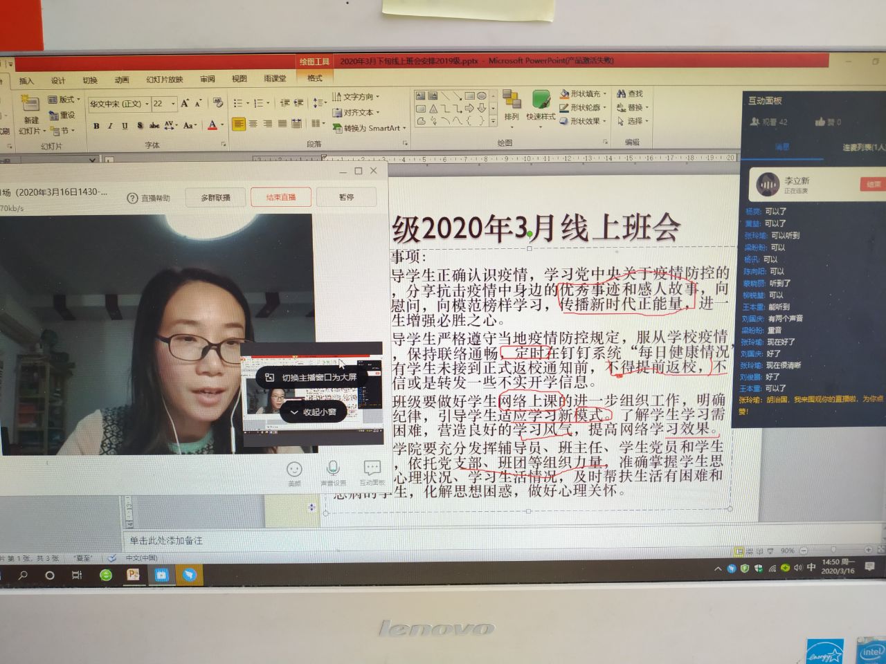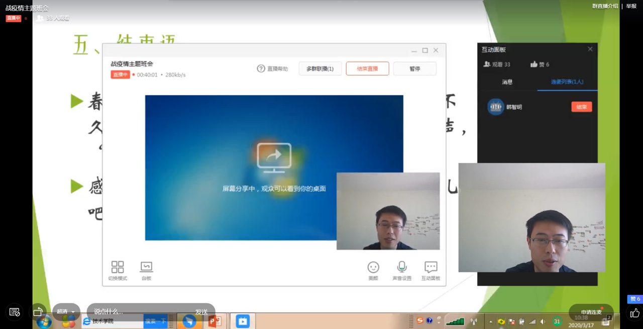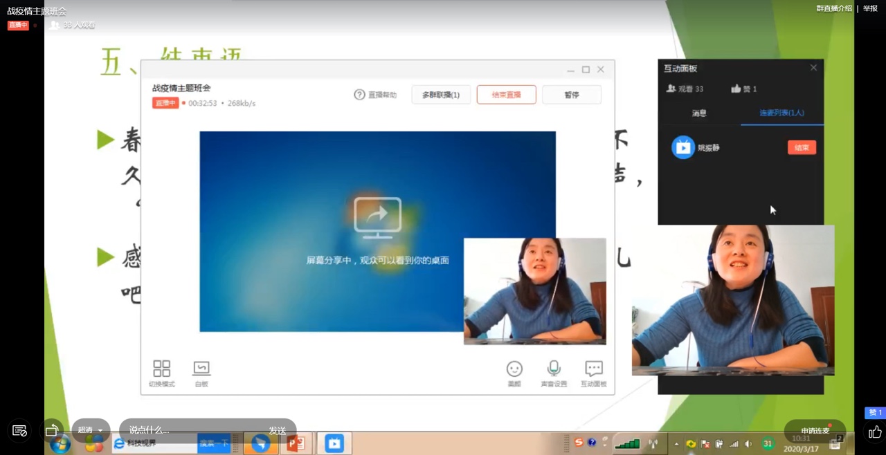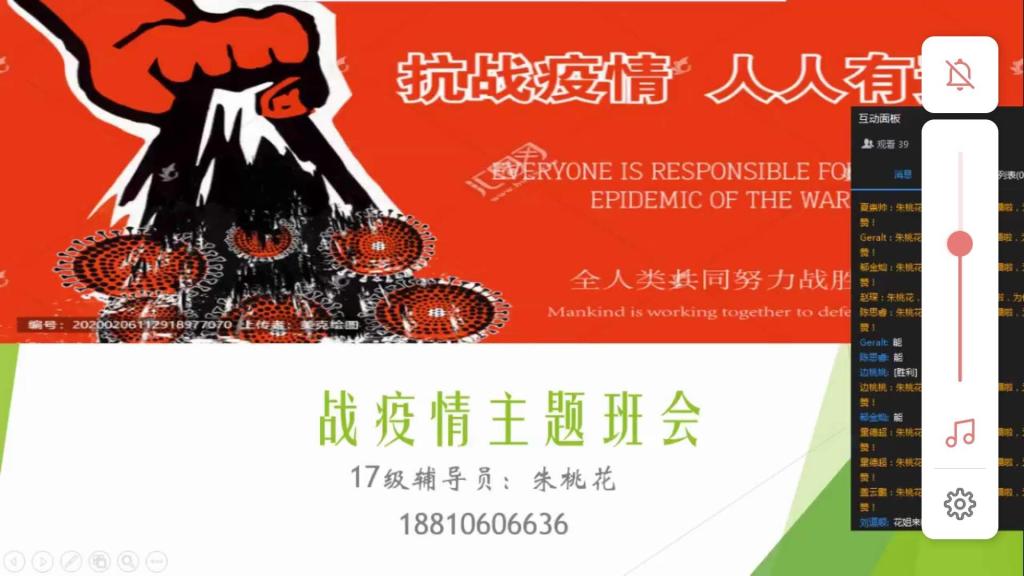 2017级的线上主题班会以班级为单位,通过钉钉直播形式召开。辅导员朱桃花主持,学院党总支书记贾甚杰、副院长姚振静以及2017级班主任韩志明、李亚男、王莉等老师参加。会上各班级湖北籍同学分享了自己在整个抗击疫情过程中的亲身经历和感受,积极参加抗击疫情志愿服务的志愿者同学分享了个人在抗击疫情志愿服务工作过程中的所见所感所悟,为同学们讲述了积极投身疫情防控志愿服务工作的难忘经历,以责任担当和实际行动展现我院新时代大学生的风采。各班级学习代表就班级同学线上学习情况做了总结报告,班主任就开学以来的线上教学工作作了简要总结,指出了线上教学中存在的问题,并对同学们如何更好开展线上学习、保证学习效果给出了指导建议。老师们和同学们积极发言,热烈讨论,亲切交流,本次线上主题教育班会收到良好效果。