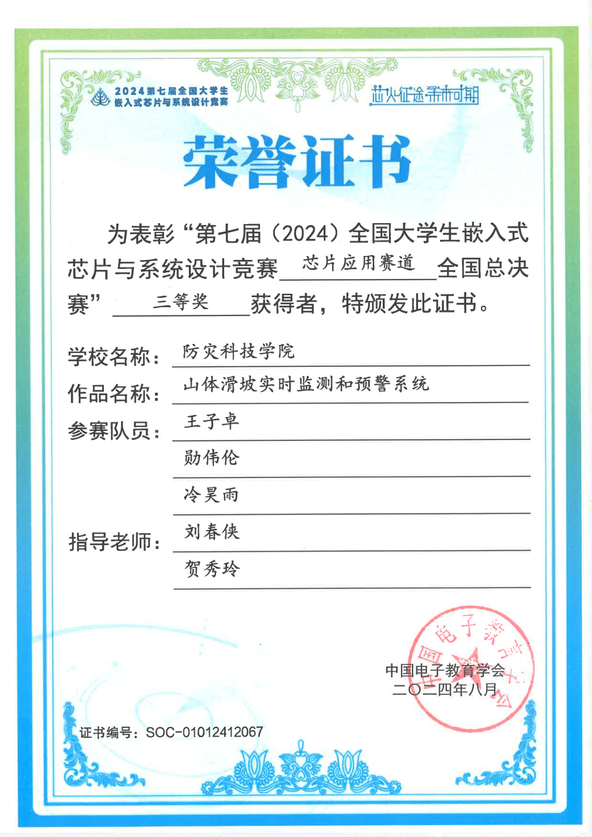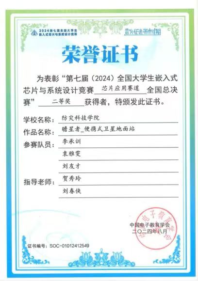近日,学校电子科学与控制工程学院组织师生参加第七届全国大学生嵌入式芯片与系统设计竞赛,在芯片应用赛道荣获北部赛区一等奖2项、二等奖2项、三等奖2项。其中,由学校刘春侠、贺秀玲老师指导,由李承训、袁雅雯、刘友才和王子卓、勋伟伦、冷昊雨六名同学分别组成的两支队伍进入全国总决赛,历经两天的现场环境适应、设备调试、现场答辩等层层挑战,最终荣获全国二等奖和全国三等奖。