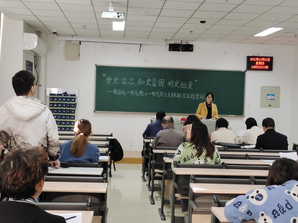 10月21日,电子科学与控制工程学院电气师生党支部联合教务处党支部共同举办“学史立志、知史爱国、明史担责”主题党日活动。教务处党支部代表吴鹏老师、电气师生党支部全体党员参加本次活动,活动由电气教工党支部书记李立新主持。