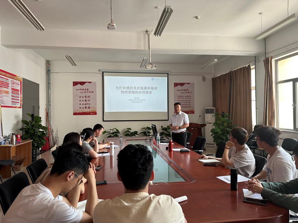 张文涛老师首先介绍了光纤传感器在地震和地球物理领域的优势,分析了光纤地震波探测的原理,对分布式声学传感、光纤光栅测量、光纤干涉3种主流技术方案进行了剖析;重点对干涉型光纤地震计、宽频带光纤地震计、光纤形变仪、光纤强震加加速度测量仪进行了详细讲解,从背景、应用及性能测试等多方面多角度进行了分析。张老师将深奥的理论讲得深入浅出、通俗易懂,整场报告干货满满,受到了师生的一致好评。