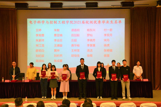 大会第一项内容:表彰优秀毕业生。首先,主持人阎光耀老师宣布2021届毕业生表彰大会开始,接着蔡建羡老师宣读了《电子科学与控制工程学院对于2021届优秀毕业生的决定》及获奖名单。各位老师分别向获得省级优秀毕业生、校级优秀毕业生以及院级优秀毕业生的优秀学生们颁发获奖证书并拍照留念。随后由贺秀玲老师作为教师代表表达了对毕业生的期望与祝福。最后贾甚杰老师总结发言,并向毕业生们送上美好的祝福。