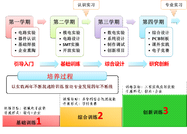 技能训练:涵盖电子技能训练(1)-(4),分别开设在本科第一-第四学期,培养学生从元器件识别、检测、焊接、仿真、装配到设计、制作、调试、测试全过程综合实践能力,以实践两年不断线,推进学科专业发展四年不断线。由浅入深,难度递增,通过不断发现问题、分析问题、解决问题,有效拓展学生知识视野,启迪专业学习兴趣,进一步培养专业综合素质及创新精神。