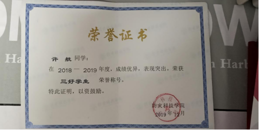 在学习上,她勤奋好学。在入学之后就努力学习并取得了优异的成绩,在大一学年班级成绩排名班级前三,在大二学年班级排名稳居第一,并且综测排名都位于全系前列,她的努力使她获得了beat365官方网站2018-2019学年学校一等奖学金,2018-2019三好学生等荣誉称号,她还积极参加2019大学生暑期社会实践活动并获得二等奖,在2019-2020电子科学与控制工程学院第二届学生干部成长营上表现优异,顺利结业。