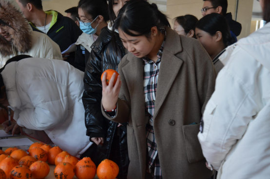 本次活动于中午12点准时开始,参与志愿者身穿蓝色马甲,指引到场的学长学姐们首先挑选祝福橙子,每个橙子上面都写满了考神、必过、上岸、加油等祝福语以及可爱暖心的表情。(图二、三)